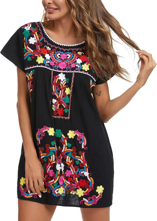 Women Mexican Embroidered Dress Short Sleeve